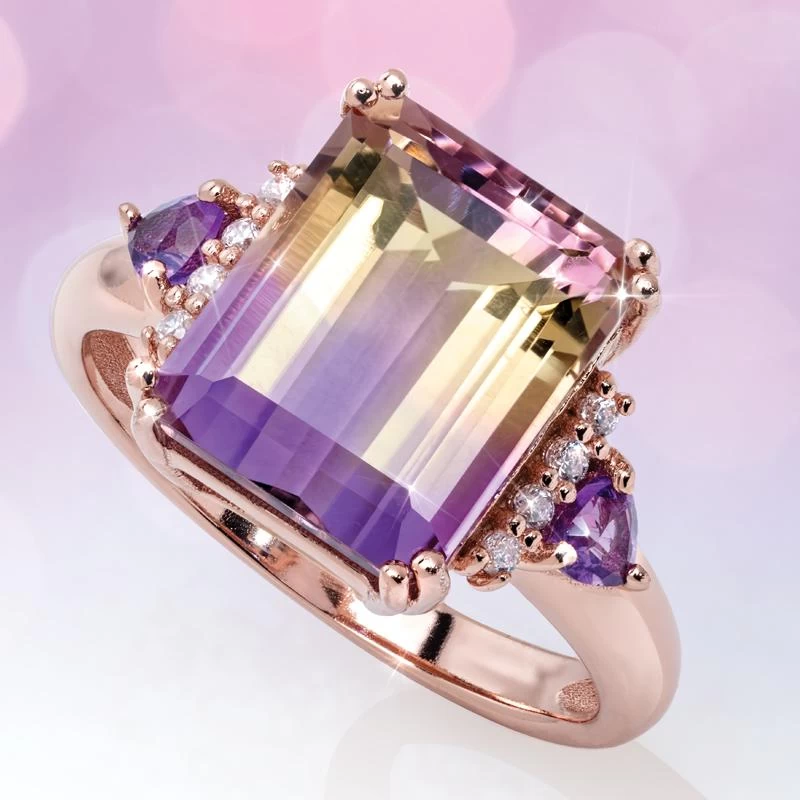 This collection celebrates the rare beauty of ametrine in gorgeous emerald-cut gems set in warm rose gold-finished sterling silver. Ametrine’s colors blend, combine, and contrast uniquely in each gem, so you are guaranteed a gem unlike any other in the world. Absolutely perfect for celebrating your one-of-a-kind love. And, blissfully priced, making it easy to say “I do.”