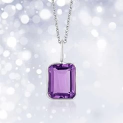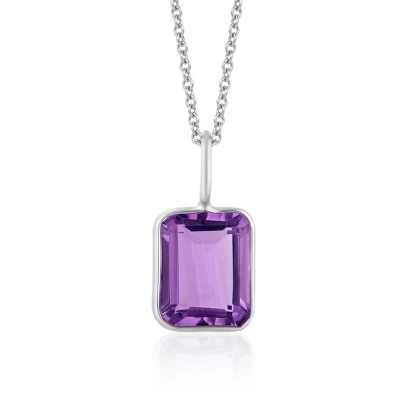 We know you can’t keep your eyes off her. Your wife is the most beautiful woman you’ve ever laid eyes on, and truth be told, you still love kissing her on the neck. Don’t risk embarrassment in public! Keep her neck covered with our Octagon Amethyst Necklace. For this startling piece of jewelry we’ve taken three carats of lush, rich amethyst in an octagon cut and beautifully framed it with a rhodium-finished .925 sterling silver necklace. This baby is classically chic and effortlessly elegant. In fact, the only thing more stunning than this necklace is the price. Comes with an 18” chain with a spring clasp. Don’t let her get caught with a naked neck. Get her the Octagon Amethyst Necklace today!