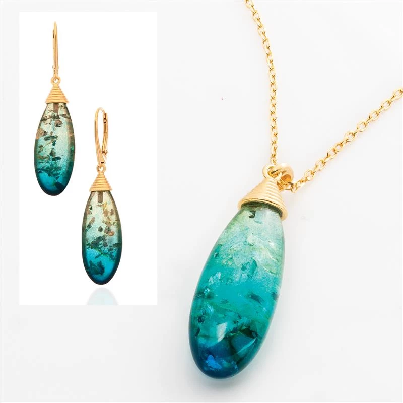 Cast in .925 sterling silver coated with yellow gold, this jewelry is designed to appeal to both ancient and modern sensibilities. Don’t get left behind the times. See for yourself why the Blue Amber Ombre Necklace and Earrings are the epitome of style in any era.
