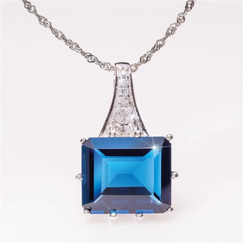 We’ve found the cream of the crop of blue helenite and had it cut and faceted by skilled craftsmen into a perfect emerald cut. Set in sterling silver, the stones flash and flicker in radiant glory, echoing its dramatic origins. To turn up the cool heat of that gorgeous blue even more, we’ve added sparkling white stones.