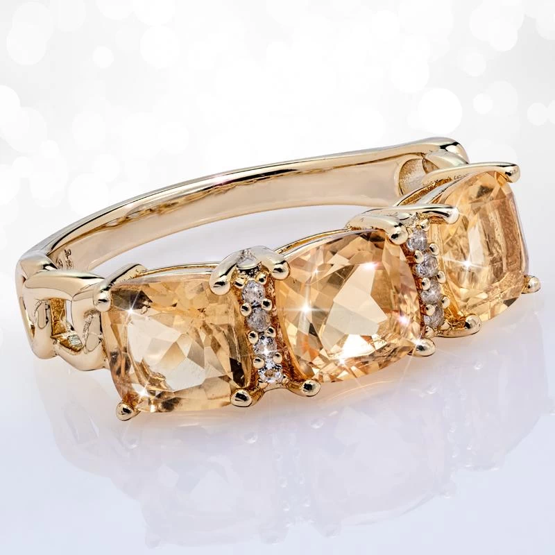 This elegant ring features almost two carats of decadent champagne citrine in three perfectly-faceted cushion cut gemstones. And, the .925 sterling silver setting is  finished in gold for even more intoxicating beauty.