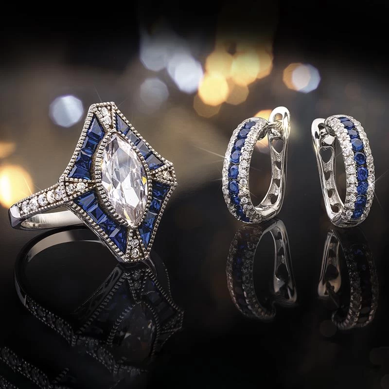 After figuring out the perfect shade of sapphire blue for this spinel, we asked our designers to craft an art deco setting for this blue marvel. The result is our Deco Darling Collection. This ring and earring set features rounds of DiamondAura®, the Ultimate Diamond Alternative®, that make this spinel’s brilliant blue pop. Give her luxe for less by decking her out in deco!