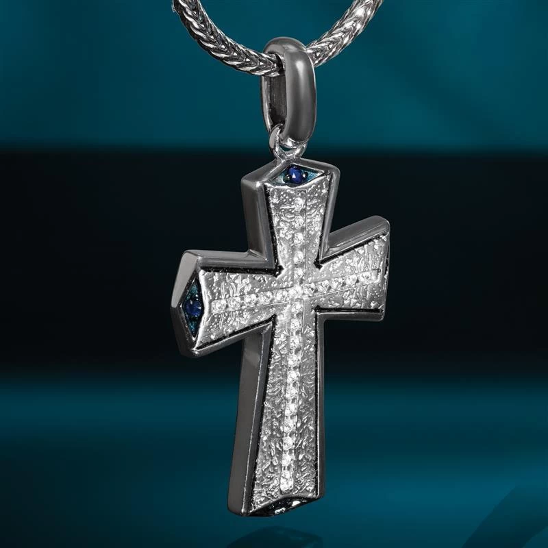Which is why our artisans have crafted the Diamond Cross Pendant, a wonderful example of this fine imagery. Comprised of white and blue diamonds embedded in a pendant of rhodium-finished .925 sterling silver, this cross pendant shows the world who you are and what you stand for. This pendant is complemented perfectly by a stainless steel chain with a woven design that’s rugged, yet stylish.