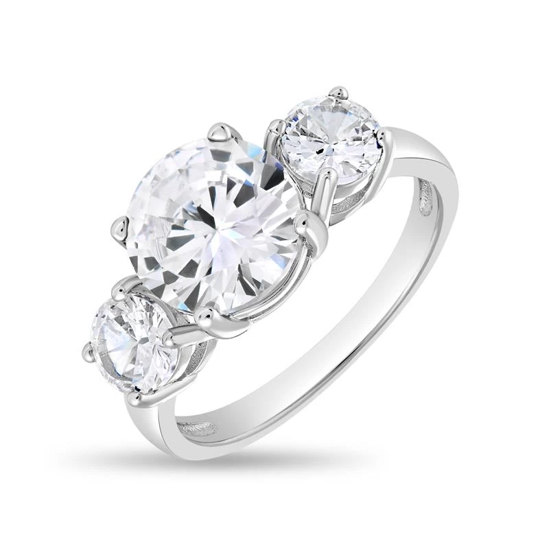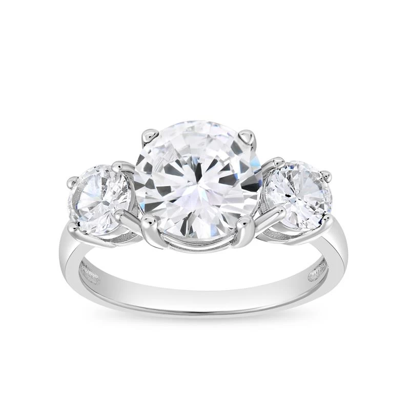 Our DiamondAura 3-Stone Classique Ring retains every jeweler’s specification: color, clarity, cut, and carat weight. The transparent color and clarity of DiamondAura emulates the most perfect diamonds (D Flawless), and both are so hard they will cut glass. The brilliant-cut maximizes the fire and radiance of the stone so that the light disperses into an exquisite prism of colors. This .925 sterling silver, platinum-layered ring is prong-set with a DiamondAura center that is showcased between two DiamondAura round brilliants.