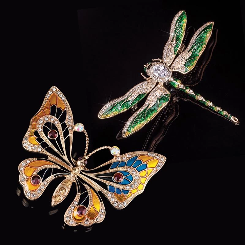 Recently jewelry connoisseurs have a renewed appetite for the intricate and fanciful designs of Art Nouveau. The Nouveau Butterfly and Dragonfly Brooches are a prime example of this exquisite jewelry without the steep estate sale price tag. Gleaming enameled mosaic work pairs with shimmering Austrian crystals to evoke a statement piece that will bring vintage-style glamour to the discerning lady with an eye for art.