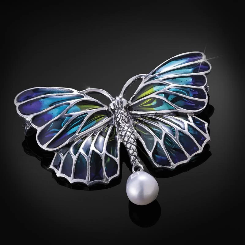 This Enchanted Garden Brooch celebrates the fanciful designs of Art Nouveau in with an enameled winged butterfly festooned with a freshwater pearl. This Nouveau fashion is always in style.