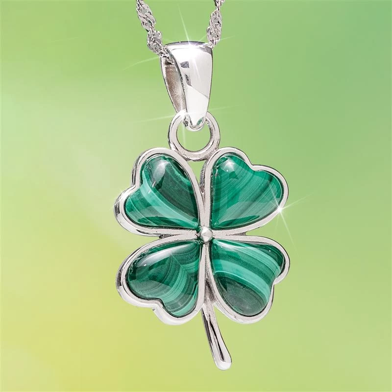 However, you see the fourth leaf––as luck or as grace–– the four-leaf clover is a fortunate find. This pendant made of beautiful malachite is also a fortunate find. Malachite not only brings lustrous green to this piece, its exquisite banded beauty gives the shamrock a remarkable lifelike appearance, as if freshly plucked from the earth. And, of course when it comes to price, you’re in luck there too!
