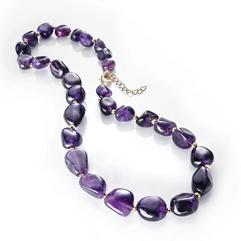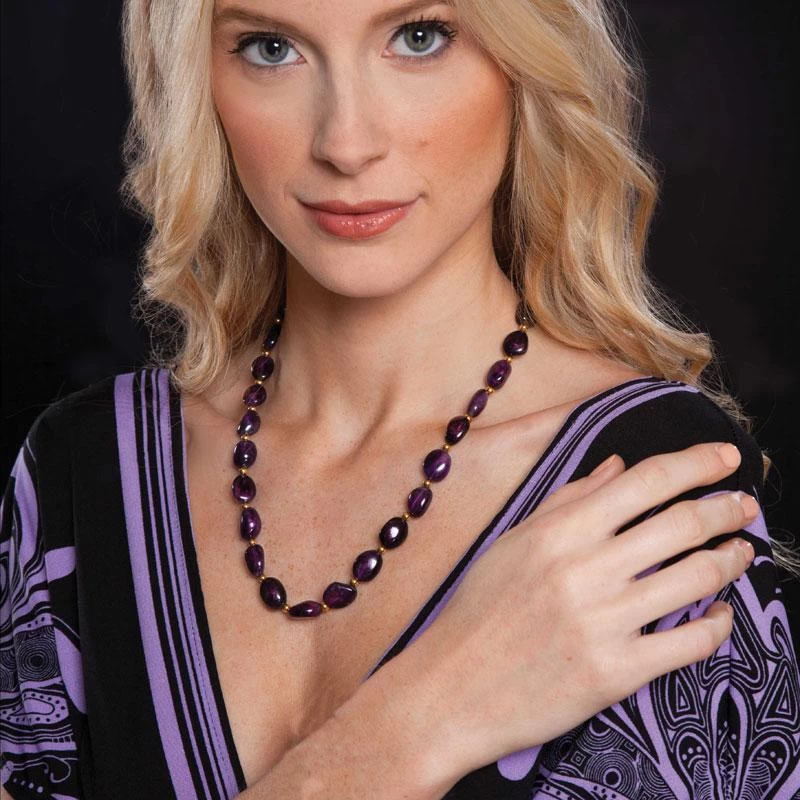 A collection of purple perfection. Your Lusso Amethyst Necklace is a 200-total carat weight symphony of smooth purple genuine gemstones. Each gemstone’s shape and translucence ignites the velvety, violet hues. The polished amethysts are hand-set on double-knotted jeweler’s thread, and the stunning 18″ necklace (with 2″ extender) secures with a gold-finished lobster clasp. Once you wear it, you’ll see that it hangs with the same weight and elegance as similar strands that sell for hundreds more.