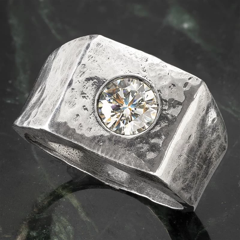 Our Rock Star Ring features a full carat of this stone that possesses the fire and brilliance of an extraterrestrial diamond but is many times rarer than its earthly counterpart. Handcrafted in Italy of hammered .925 sterling silver, this ring emanates power, as well as a special, otherworldly charisma.