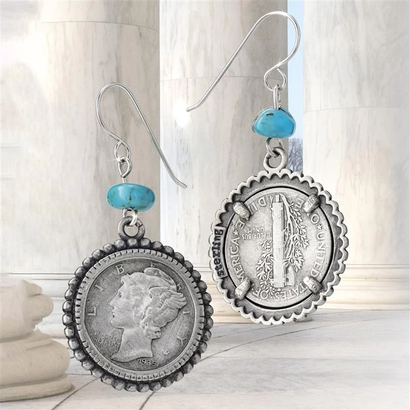 Embrace the mystery with these earrings. Fashioned from real silver Mercury dimes, these earrings are accented with another wonder –– Sleeping Beauty turquoise. This gorgeous blue gemstone comes from a mine located near Globe, Arizona and is named after the mountain range where it is located, which from a distance is said to resemble a sleeping woman with her arms crossed. These earrings are certain to make heads turn.