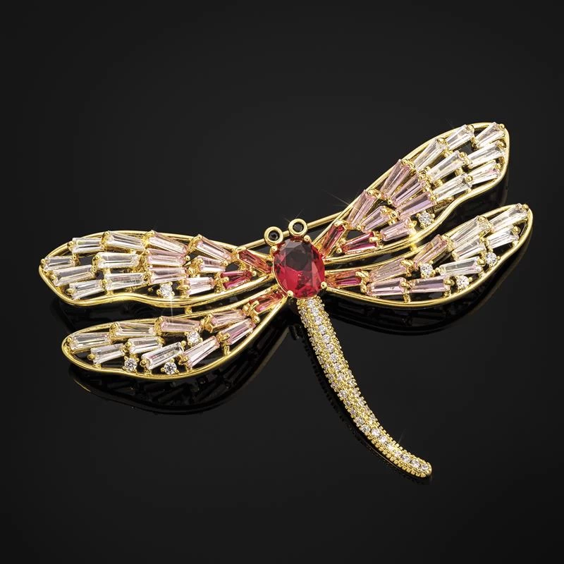 Delightfully chic and exquisitely detailed, this brooch features an artfully stylized depiction of one of nature’s smallest wonders, rendered in dazzling baguettes of DiamondAura®, the Ultimate Diamond Alternative® that rivals the finest mined diamonds in terms of fire and clarity. Here, the daring dragonfly boasts a ruby-red center and pink and white wings. Finished with yellow gold, this brooch offers high-end impact for a diminutive price. Â