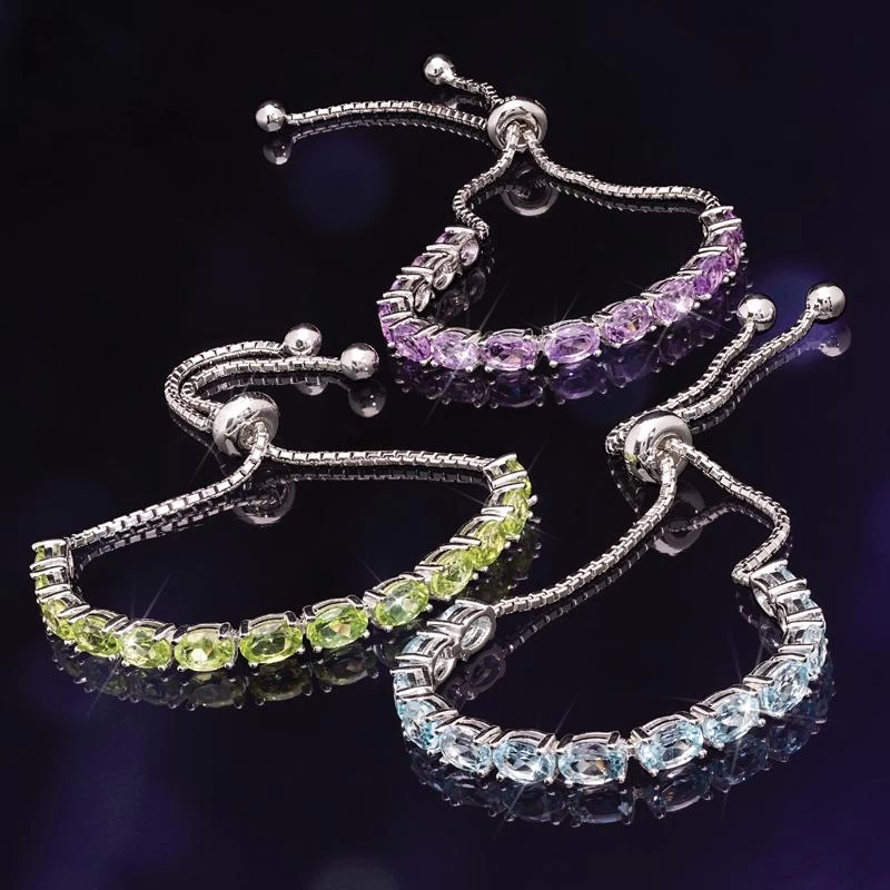 Each bracelet features 13 oval-cut genuine gems set in .925. sterling silver. The bolo-style sliding closure makes adjusting these bracelets a breeze.