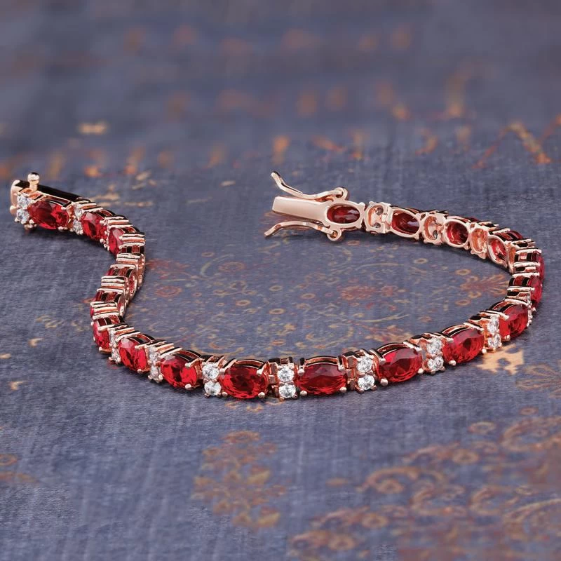 The Stress-Free Glamour Bracelet is a dressed up sterling silver tennis bracelet that sparkles with all the beauty of rubies but without the steep price. Created under pristine conditions, the Ultimate Diamond Alternative™, DiamondAura® has all the fire, clarity and glamour of the world’s best mined rubies. In fact, you have the scientific advantage of achieving near perfect stones. An 11 carat ruby and diamond bracelet that looks this good would set you back over $6,000. The Stress-Free Glamour Bracelet has a much more relaxing price.