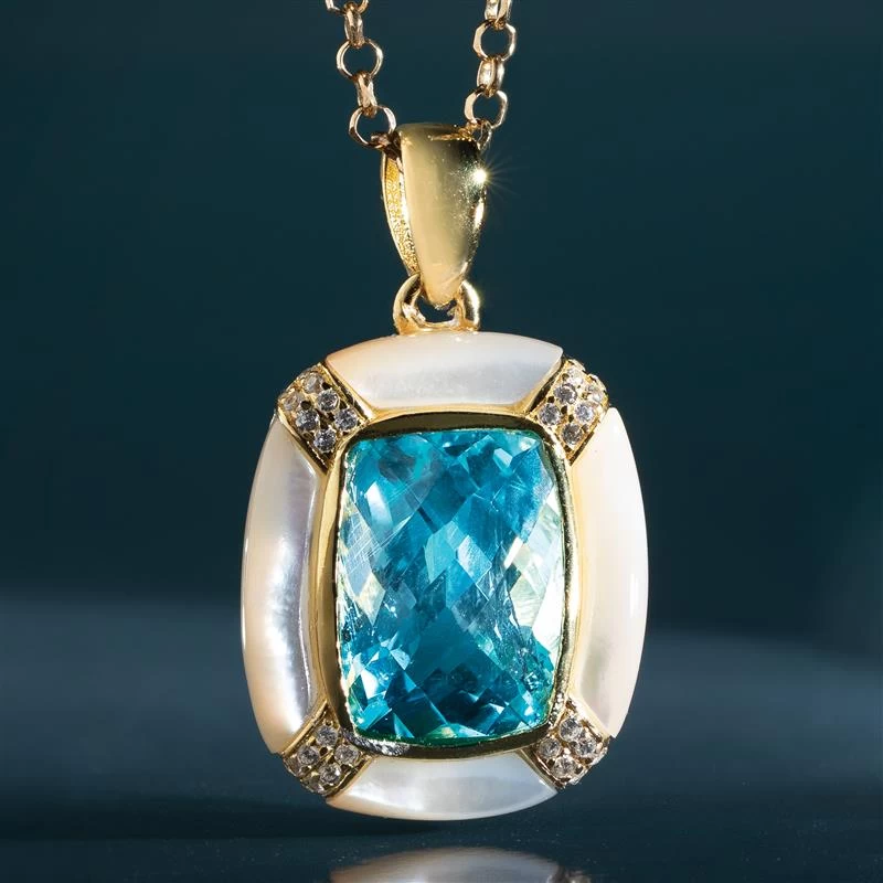 This piece has inspired the Sultan’s Special Blue Topaz and Mother-of-Pearl Pendant. This jewelry carries all the enchanting mystique of the Levant. This pendant shows off the exceptional color of these stones surrounded by yellow gold-finished .925 sterling silver.