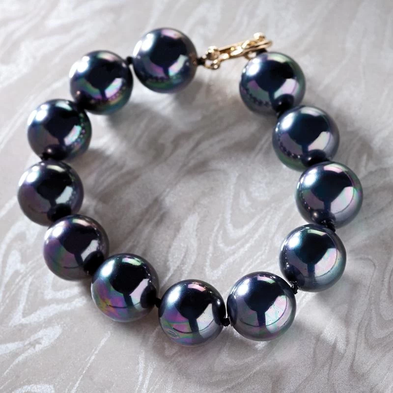 By speeding up and taking control of the process, we created our Tahiti Black Peacock Bracelet, a stunning strand of consistently round and luminous Tahiti Black Peacocks. The 7 1/2“ bracelet features exceptionally large 14mm spheres and is hand-strung, double-knotted and secures with an elegant, gold-fused toggle clasp. Each braclelet captures the vivid luster and heavyweight feel without the exorbitant cost. Our Tahiti Black Peacocks are also more durable and less porous for better wear. The must-have accessory for those romantic nights that keep you out long after dark.