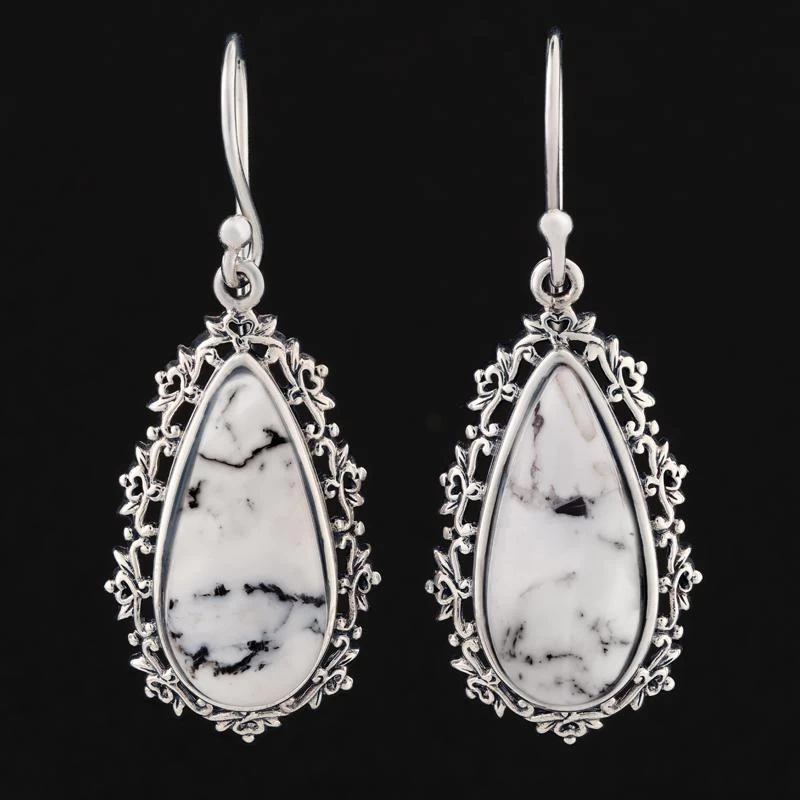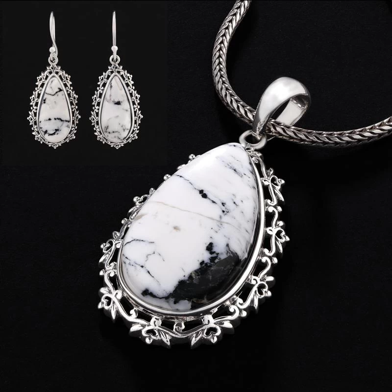 The White Buffalo Collection celebrates the unique and rare beauty of this legendary stone. Generous cabochons of White Buffalo are set in filigreed sterling silver settings with an antiqued finish that beautifully complements this rare desert gem. This collection is so much more than beautiful jewelry. Each piece is a Native American artifact steeped in meaning and history. It’s time you owned a legend. Includes Pendant, 18” Bali Naga Woven Chain, and Earrings.